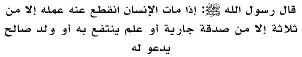 Mafhumnya Rasulullah SAW bersabda: " Apabila mati seorang manusia, terputuslah daripadanya amalannya kecuali tiga (3) perkara: (1) Sedekah jariah; (2) ilmu yang dimanfaatkan; (3) dan juga anak soleh (atau solehah) yang mendoakan kepada kedua ibu bapanya."