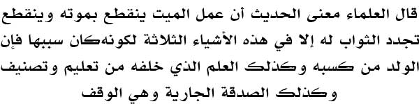 Mafhumnya al-Imam an-Nawawi berkata di dalam syarahnya: " Berkata para ulama: 'Makna hadis ini ialah bahawa amalan si mati akan terputus dengan kematiannya dan terputus juga pembaharuan pahala baginya melainkan pada tiga (3) perkara ini kerana ia (3 perkara tersebut) menjadi sebab (terwujudnya kebaikan-kebaikan). Maka sesungguhnya anak dari amalannya. Demikian juga ilmu yang ia ajarkan dan sedekah jariah iaitu wakaf." (Sahih Muslim bi Syarh an-Nawawi 11/85)